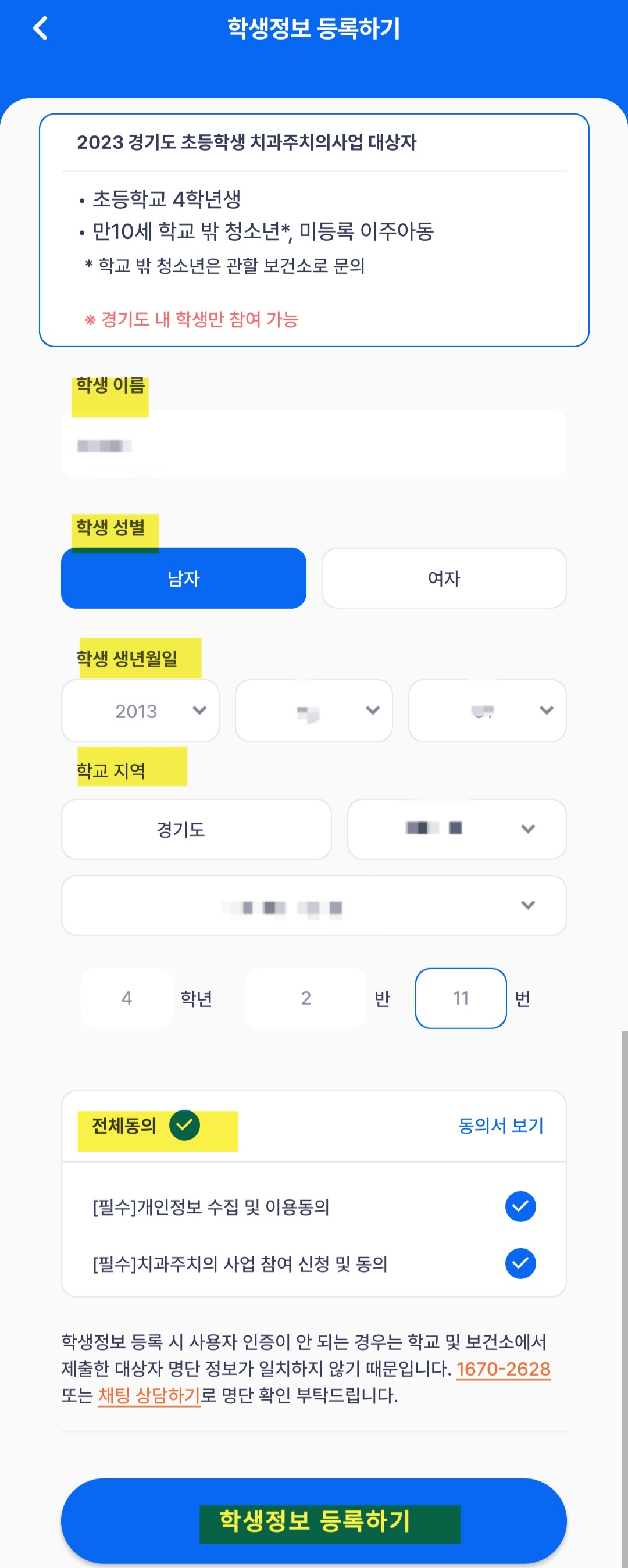 [학생정보 등록하기] 들어가셔서 학생이름, 학생성별, 학생 생년월일, 학교지역을 작성하 동의서 전체동의를 합니다.