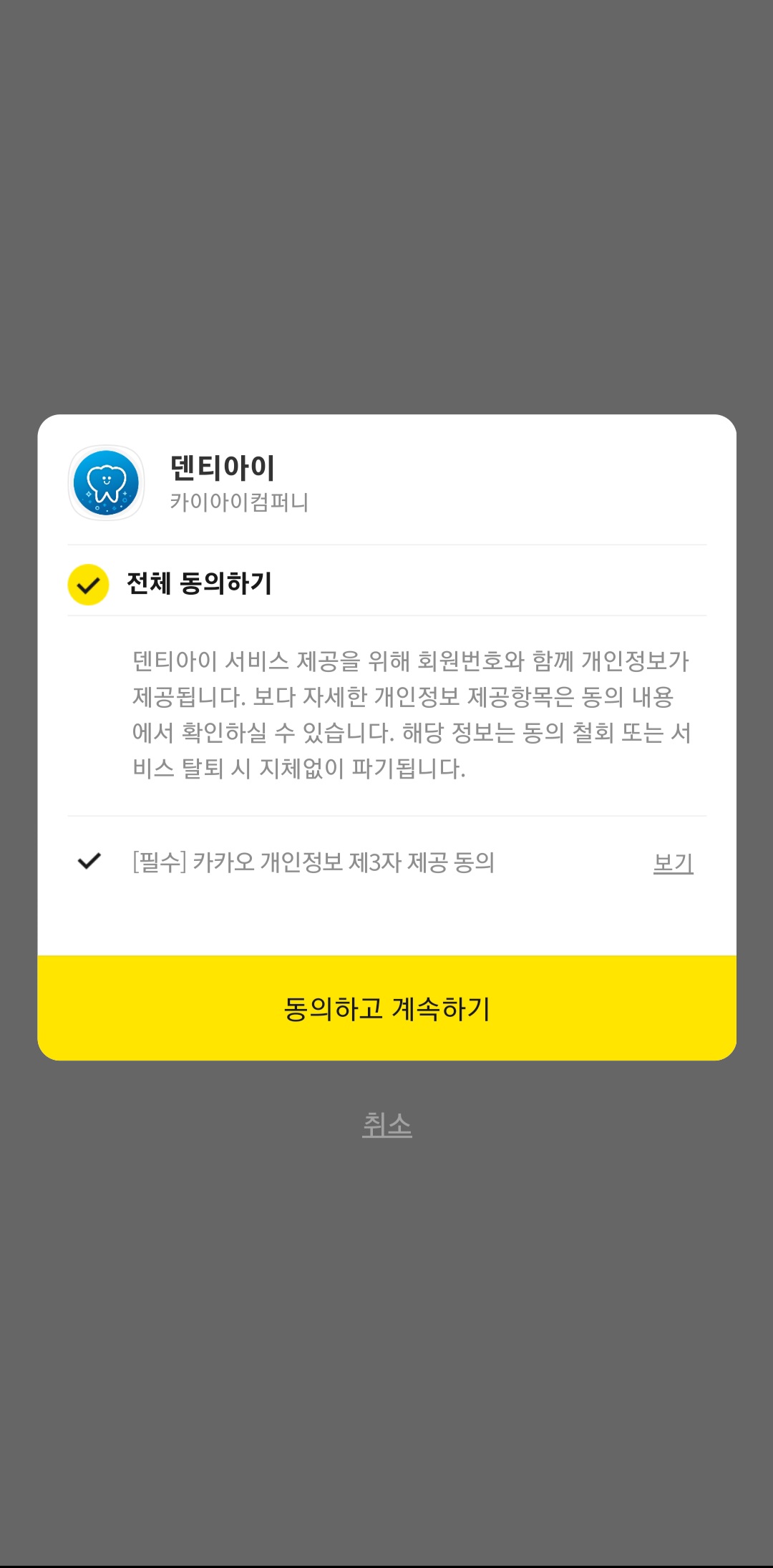 카카오계정 로그인을 함으로써 덴티아이에 제3자정보제공 동의하고 로그인합니다.
