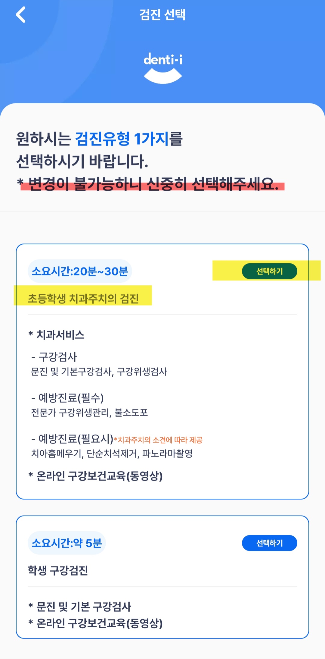 검진 유형을 선택해야 합니다. 학생 구강검진이 아닌 "초등학생 치과주치의 검진"을 선택하셔야 합니다.