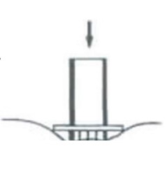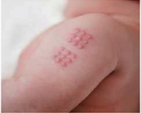 삼각근 하단부위에 주사액을 펴 바른 후, 9개의 바늘이 있는 주사도구를 이용하여 두 번에 걸쳐 강하게 눌러 백신을 흡수시킴![]() |